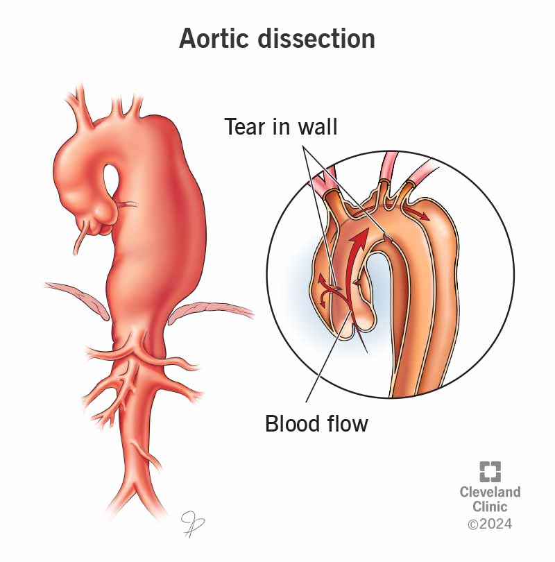 An aortic dissection is a serious and potentially life-threatening condition where the inner layer of the aorta—the large artery that carries blood from the heart to the rest of the body—tears. Blood surges through the tear, causing the inner and middle layers of the aorta to separate (dissect). If the blood-filled channel ruptures through the outer layer, it can be fatal.